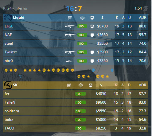 Начало третьей карты можно смело оставить за стороной атаки, третий раз за защиту начинают SK, 4-1. Тотальная доминация, - так проходила середина «инферно», в исполнении Steel`a и ко, 9-1. Очень сильная атака против бразильской зашиты уничтожает оборону раз за разом, 12-1. Не могут найти себя ребята из Бразилии, 14-1 счёт первой половины. Пистолетный раунда за атакой, после смены сторон, 14-2. Начинают возвращаться в игру террористы, набирая серию, но от дают матч-поинт, 15-4. В двадцатом, американцы могли закончить, однако с камбэчной уже соединили, и противники продолжают набирать раунды, 15-7. И они делают это! Team Liquid, проиграв свой пик, выигрывают эту встречу, 16-7. Счёт серии: 2-1.