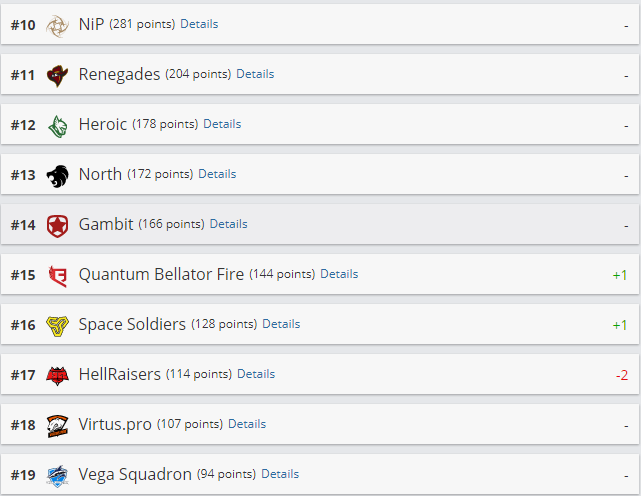 Quantum Bellator Fire и Space Soldiers прибавили по одному пункту и заняли 15 и 16 места соответственно. HellRaisers опустилась на 17 строчку.