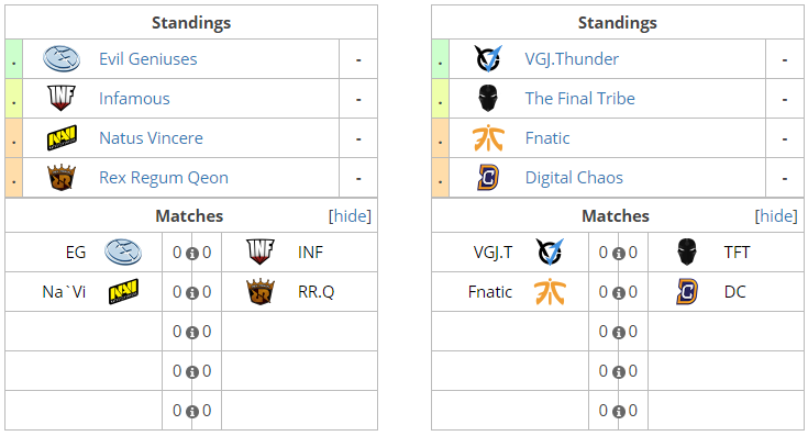 По итогам жеребьевки в группу «А» попали Natus Vincere, Rex Regum QEON, Union Evil Geniuses и Infamous. А в группе »В» встретятся VGJ.Thunde, Fnatic, The Final Tribe и Digital Chaos. Дебютный матч GESC: Indonesia Minor пройдет между EG и Infamous, а Na`Vi сыграютс Rex Regum QEON. В параллельной группе VGJ сразятся с The Final Tribe, а Fnatic встретится с DC.