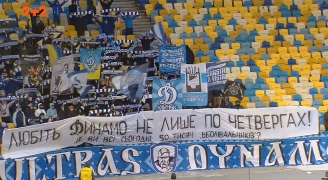 Фаны «Динамо» во время матча с «Ворсклой» баннером пристыдили болельщиков, которые поддерживают команду только в матчах Лиги Европы. «Любите «Динамо» не только по четвергам. Где вы все сегодня, 50 тысяч болельщиков?»