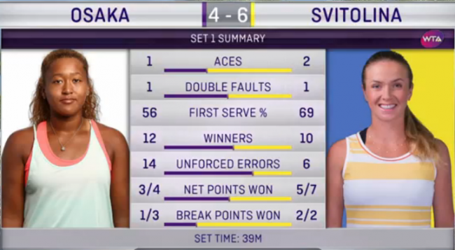 В первой части стартовой партии обе теннисистки испытывали некоторые с проблемы со стабильной игрой. В третьем гейме Свитолина сделала быстрый брейк на подаче соперницы, но дальше провалилась и счет сравнялся. Осака играла мощнее, особенно это чувствовалось, когда у японки проходила первая подача. Стоит отдать должное Элине, она не тушевалась, играла максимально глубоко, вытягивали сложнейшие мячи. Эта настырность принесла Свитолиной еще один брейк в 7 гейме. Как ни старалась Осака, но ее преимущество в мощи не сломило украинку. Свитолина показала теннис высочайшего уровня и выиграла первый сет.