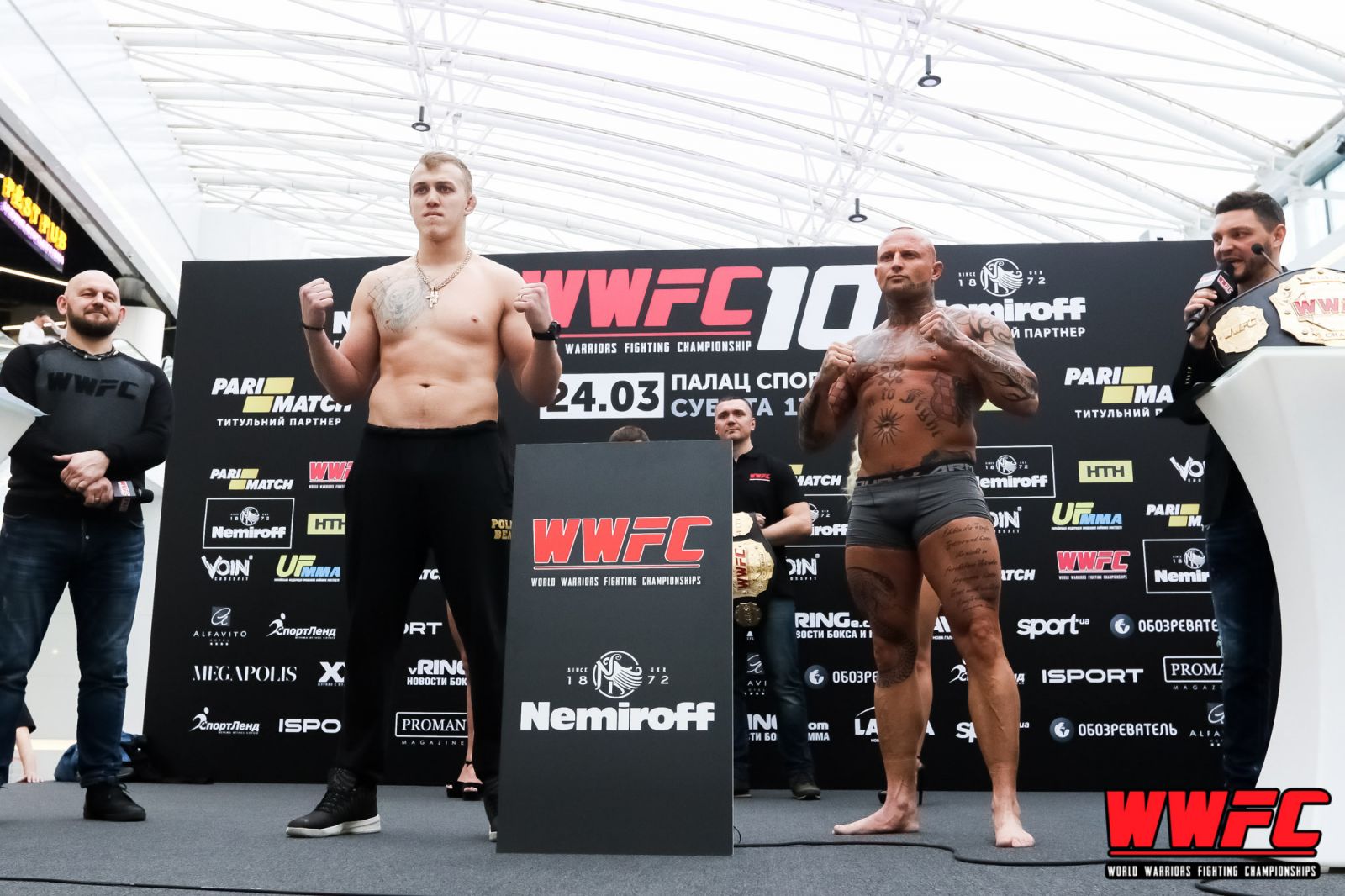 23 марта в ТРЦ «Lavina Mall» прошла официальная процедура взвешивания участников масштабного международного турнира по смешанным боевым искусствам WWFC 10, который состоится 24 марта в киевском Дворце спорта. В рамках увлекательного файткарда из 12-ти поединков выступят высококлассные представители боевых искусств Украины и других передовых школ ММА со всего мира, а главным событием шоу станут сразу три боя за титулы чемпиона мира по версии WWFC.