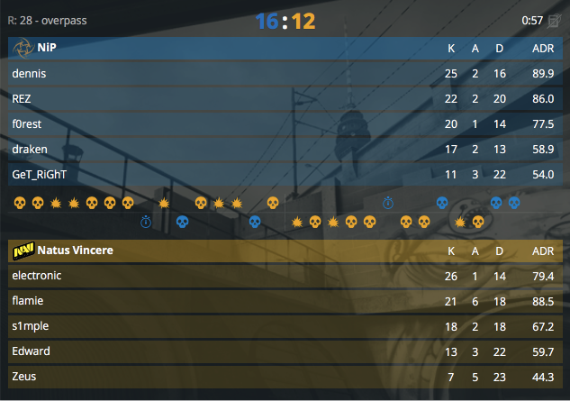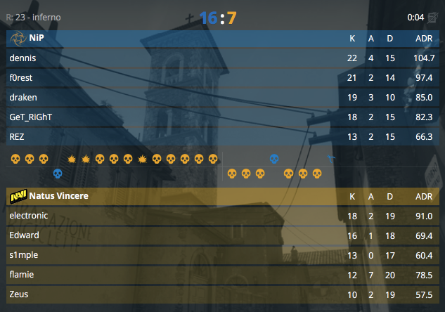 Ninjas in Pyjamas ударно начинают первую половину и берут пять раундов кряду. Natus Vincere вынуждены брать тактическую паузу, после которой коллектив из СНГ берет лишь один раунд и вновь теряет всю экономику — 1:8. Шведы продолжают проводить успешные атаки и заканчивают первую половину со счетом 12:3. Меняясь сторонами, NaVi берут вторую пистолетку и начинают погоню за соперником. Взяв пять раундов кряду, коллектив из СНГ допускает ошибку и проигрывает карту со счетом 16:12.