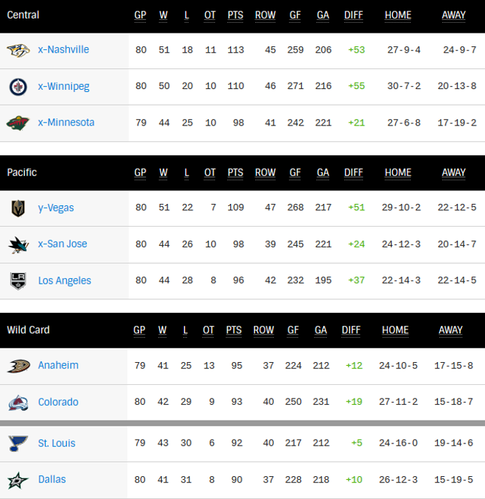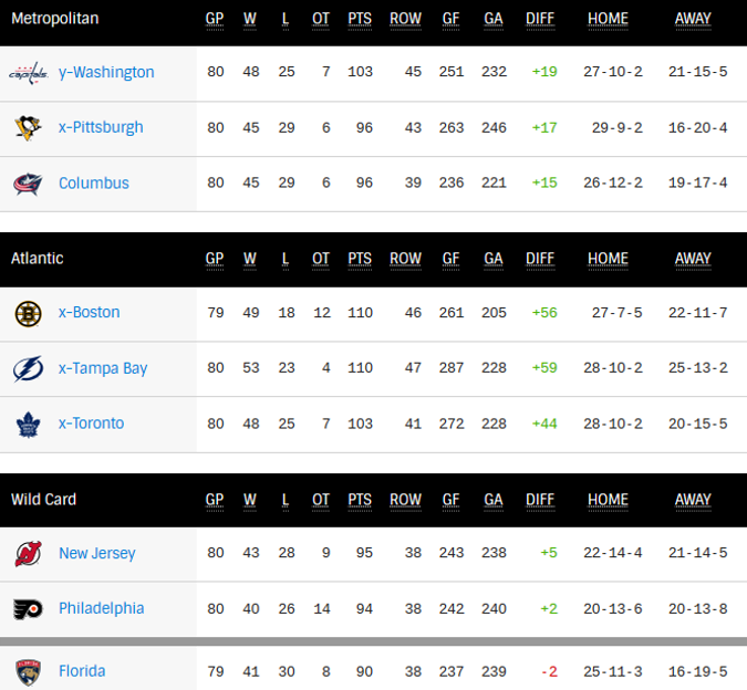 На первом wild-card месте Востока удерживается Нью-Джерси, обыгравший Нью-Йорк Рейнджерс 5:2 благодаря четырем набранным баллам Тэйлора Холла. Дьяволы могли переместиться на третье место Столичного дивизиона, однако там находится Коламбус, который сумел обыграть Детройт 5:4 в овертайме.