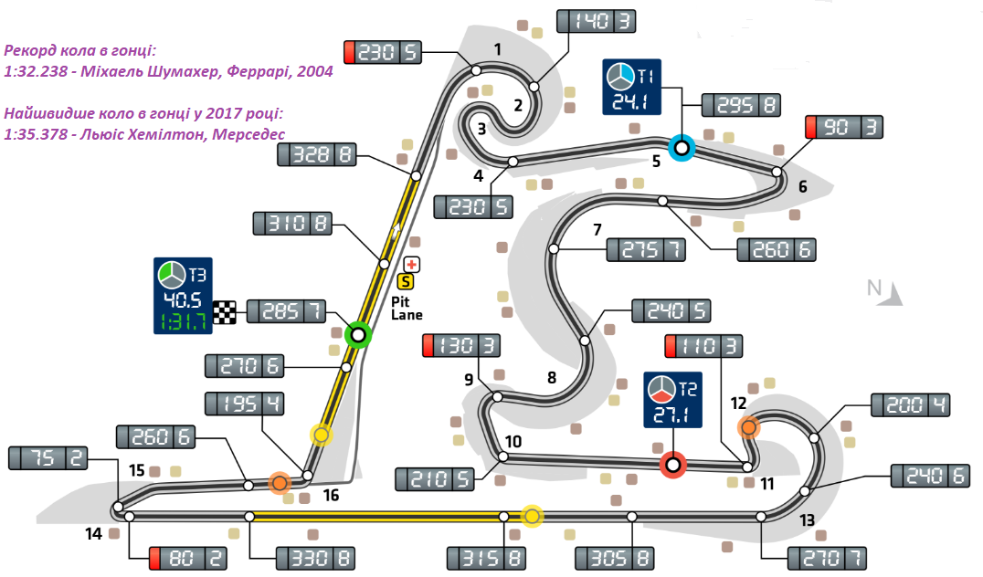 кваліфікація: 1:31.678 (2017, Льюіс Хемілтон) гонка: 1:32.238 (2004, Міхаель Шумахер) |