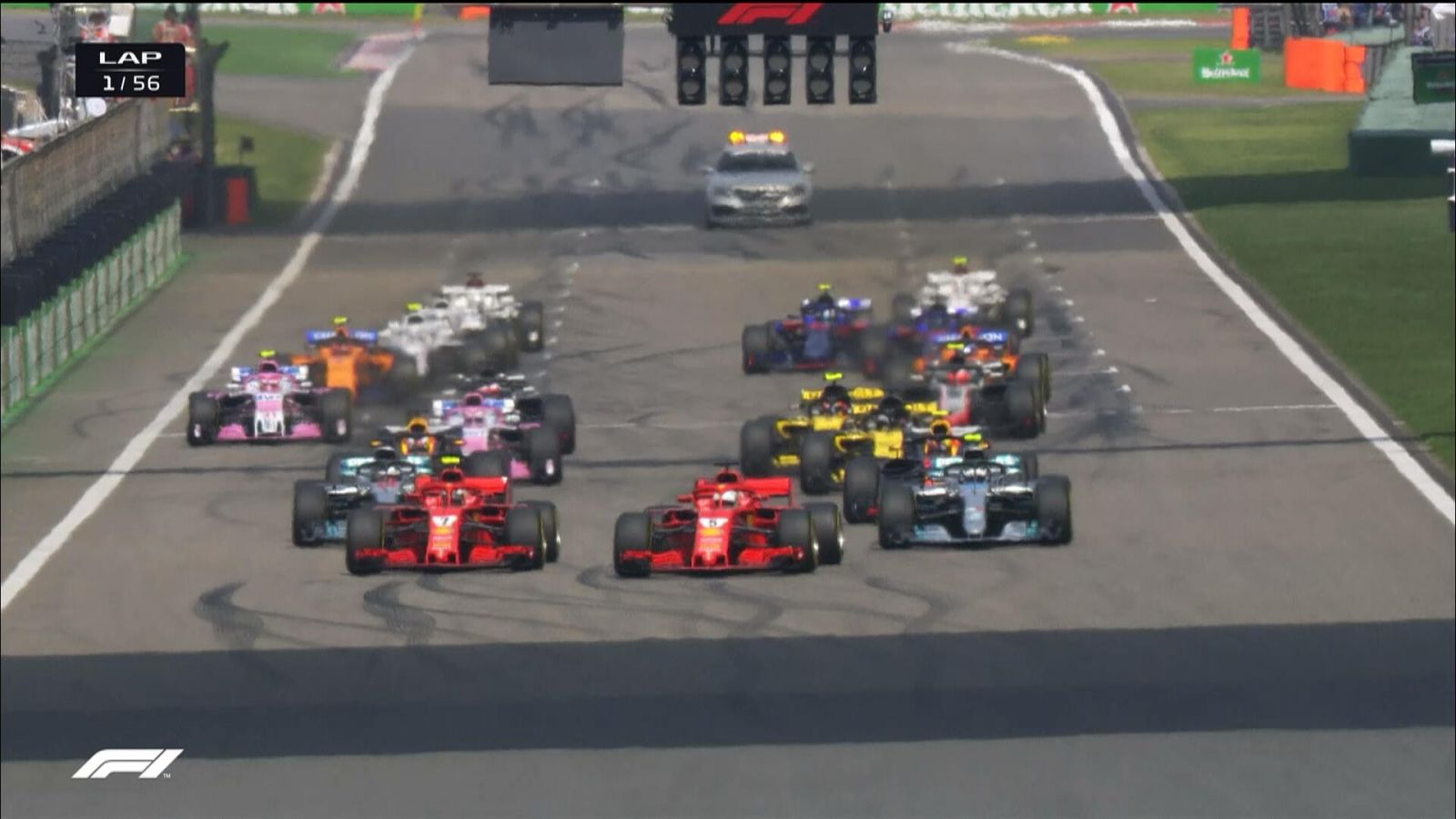 Як і минулого тижня старт гонки для пілотів «Феррарі» вийшов полярним – Феттель зберіг лідерство, але при цьому завадив Райкконену, який опустився на 4-те місце, пропустивши Боттаса з Ферстаппеном – перевага UltraSoft для Макса спрацювала на відмінно. Пілоти «Рено» на першому колі двічі обмінялися позиціями – спочатку Сайнс обігнав Хюлькенберга, та потім Ніко повернув втрачене. В першій десятці найбільше програв Перес, опустившись з 8-го на 14-те місце.