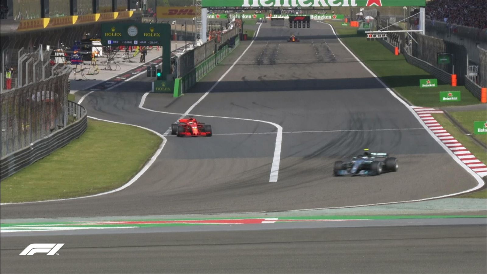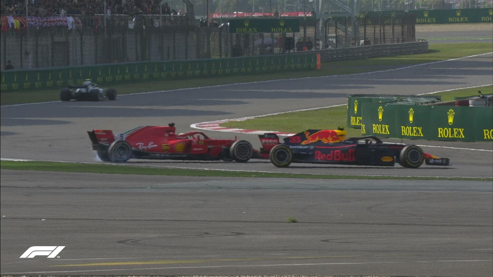 Наступною «жертвою» пілотів «Ред Булл» мав стати Феттель. І він нею став, причому буквально – спочатку Ріккардо спокійно пройшов німця, а вже на наступному колі Ферстаппен нічого кращого не придумав як повторити маневр Гаслі, в’їхавши у «Феррарі» в тій самій шпильці після довгої прямої. Обидві машини розвернуло і повз них проїхали Хемілтон з Райкконенм, причому Кімі зметикував як це зробити краще і зумів опинитися попереду Льюіса.
