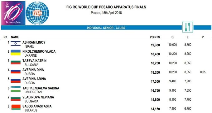 На втором этапе Кубка мира по художественной гимнастике, который проходит в итальянском Пезаро, Украина была представлена в трех финалах: с булавами, с мячом и с мячом/скакалками.