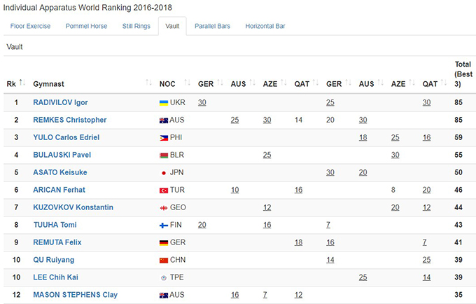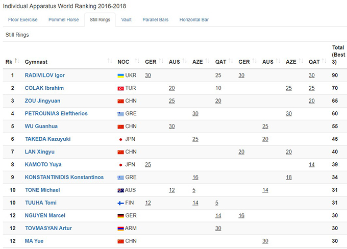 Игорь Радивилов, благодаря двум последним победам в Дохе, стал победителем серии этапов кубка мира 2016-2018 гг. в отдельных видах, на кольцах и в опорном прыжке: