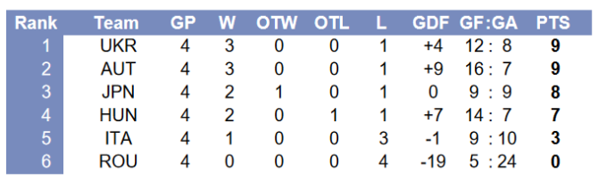 Перед последним туром, который пройдет 20 апреля, Украина и Австрия набрали по 9 баллов. Наши ребята в решающей встрече сыграют с аутсайдером Румынией, и победа в основное время гарантирует Украине первое место и повышение в классе.