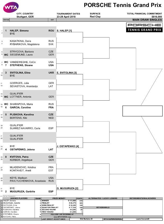 Свитолина получила в Штутгарте третий номер посева и пропускает первый раунд. А во втором раунде ее соперницей будет победительнца пары Юлия Гергес (Германия) - Анастасия Севастова (Латвия).