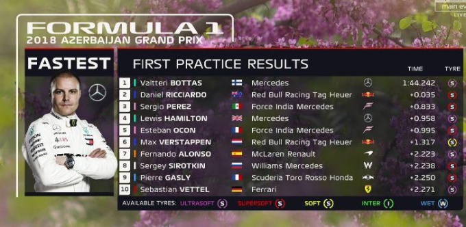 Первая практика в Азербайджане завершилась лучшим временем Валттери Боттаса, однако серьезную борьбу Мерседесу сумели навязать в Ред Булле.