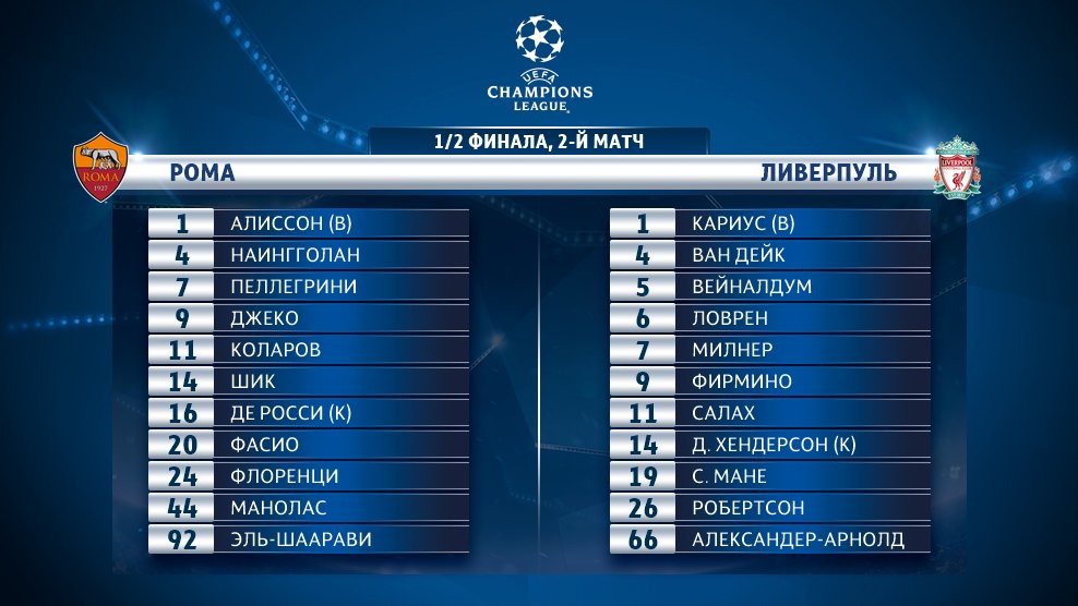 Итальянская «Рома» и английский «Ливерпуль» объявили стартовые составы на ответный полуфинальный матч Лиги чемпионов.