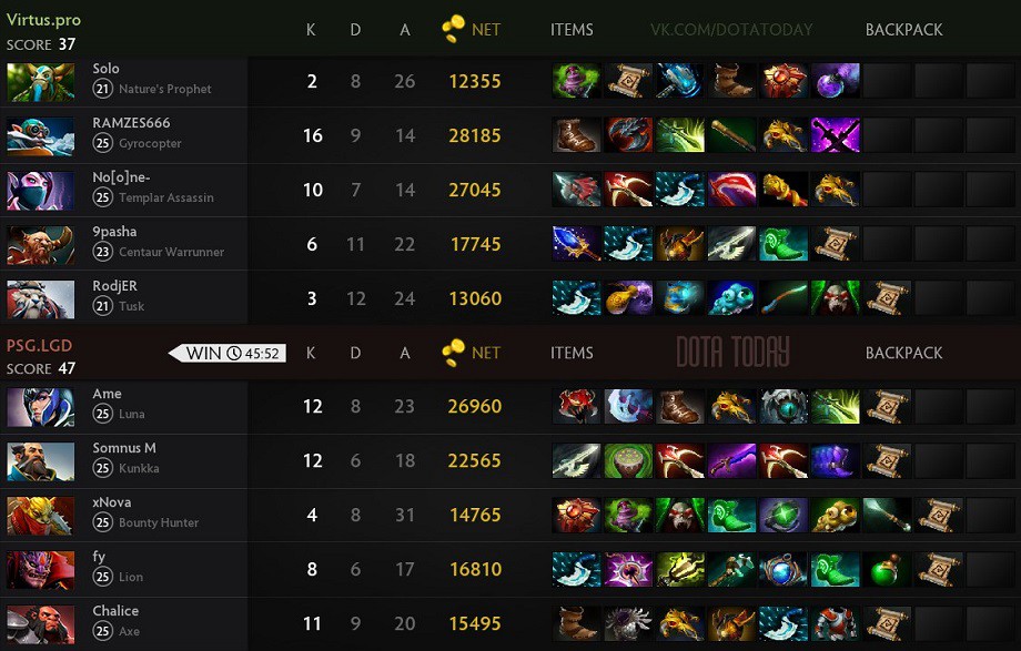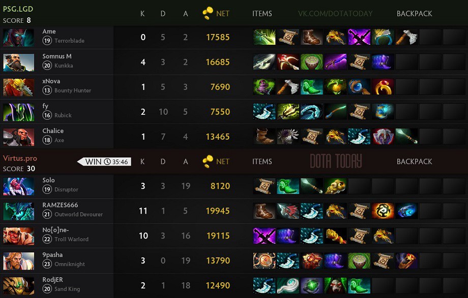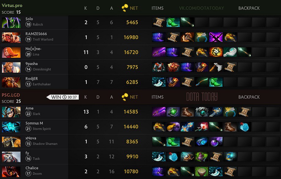 PSG.LGD прошла в следующий раунд, где встретится с Team Liquid. Virtus.pro упала в нижнюю сетку, где сыграет против Mineski.