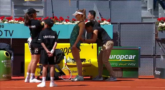 После помощи физиотерапевта француженка доиграла матч до конца, выиграв всего 2 розыгрыша из 14.