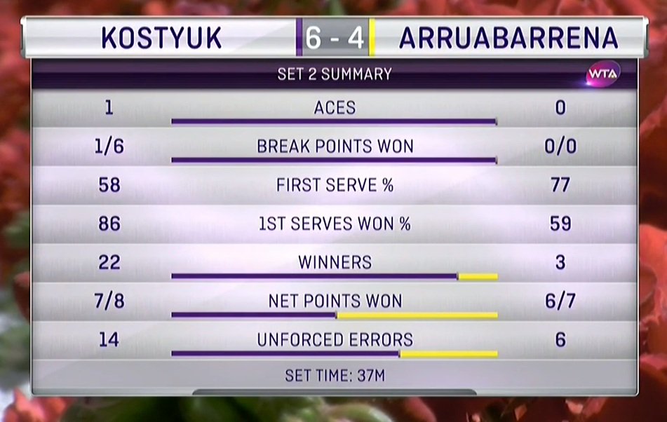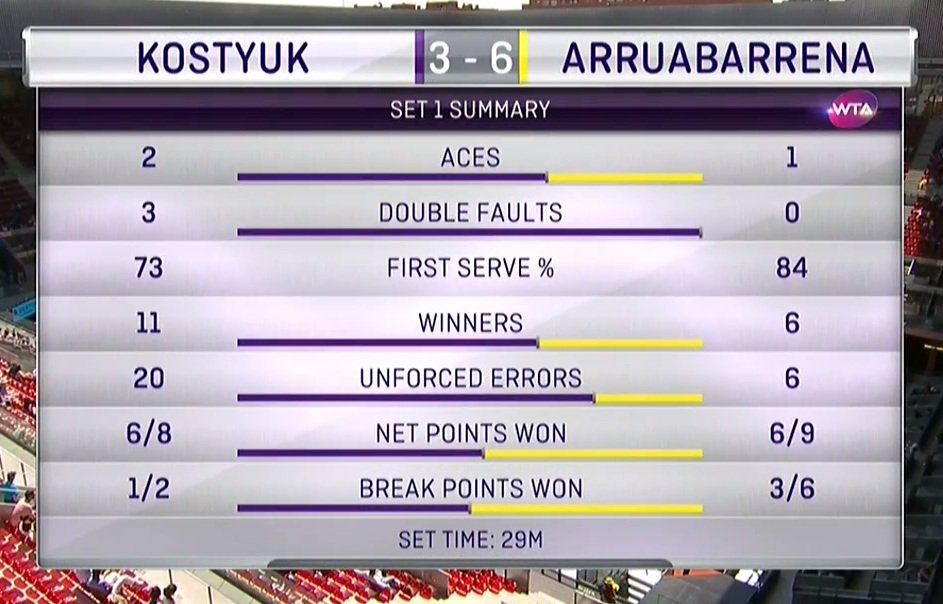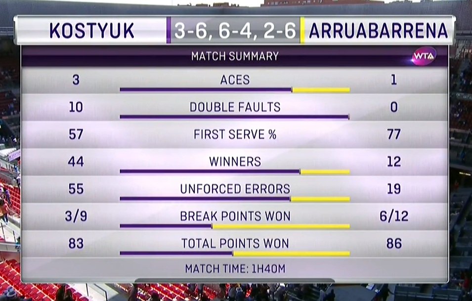Третий сет должен был стать продолжением второго. Костюк быстро повела с брейком, но на своей подаче занервничала и сделала 3 двойные ошибки. После разговора с мамой, которая является ее тренером, Марта немного успокоилась и в четвертом гейме отыгралась с 0:30, не побоявшись в самый ответственный момент сыграть очень тонко. Что касается Арруабаррены, то она играла стабильно на протяжении всего поединка, видимо это больше всего и нервировало юную украинку. В шестом гейме испанка дождалась своего шанса и со второго раза реализовала еще один брейкпоинт в решающей партии. В этот момент стало ясно, что победы нам сегодня не видать. 44 виннерса и 55 невынужденных ошибок – таков результат поединка для Марты, у Арруабаррены – минус 7 и 77% первой подачи.