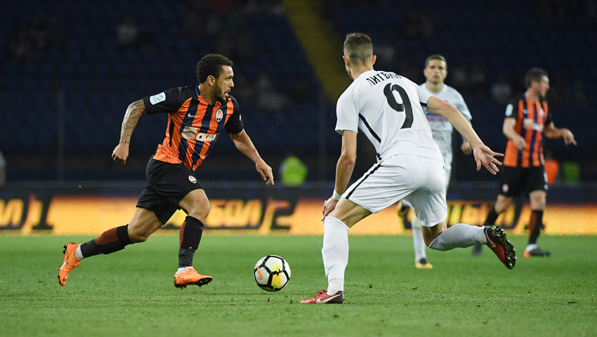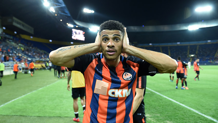 Полузащитник «Шахтера» Тайсон празднует победный мяч в ворота «Зари».