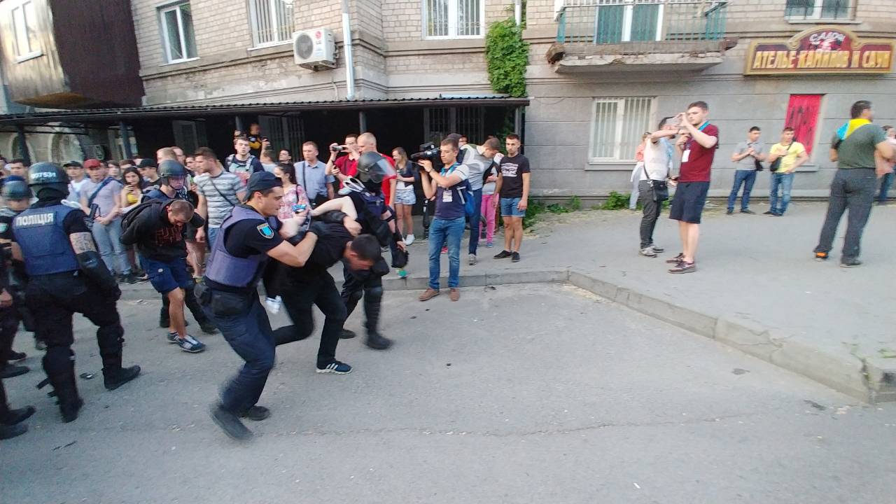 Во время объединенного марша ультрас к стадиону с акцией «Против футбола по паспортам», в котором приняли участие фаны «Динамо», «Днепра» и «Шахтера», сотрудники правопорядка попытались успокоить наиболее разгоряченных фанов. Это стало поводом для конфликта: фаны пытались «отбить» своих товарищей, бросая петарды и камни.