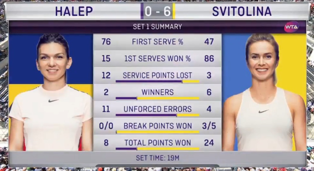 Ідеальний матч від Еліни, хіба що трошки зм'якшила гру українка в кінцівці, добре що Халеп не повернулася в гру.