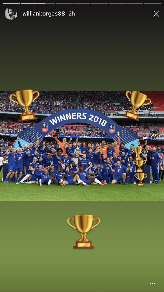Полузащитник «Челси» Виллиан на своей официальной странице в социальной сети Instagram опубликовал командное фото после победы в финальном матче Кубка Англии с «Манчестер Юнайтед» (1:0).
