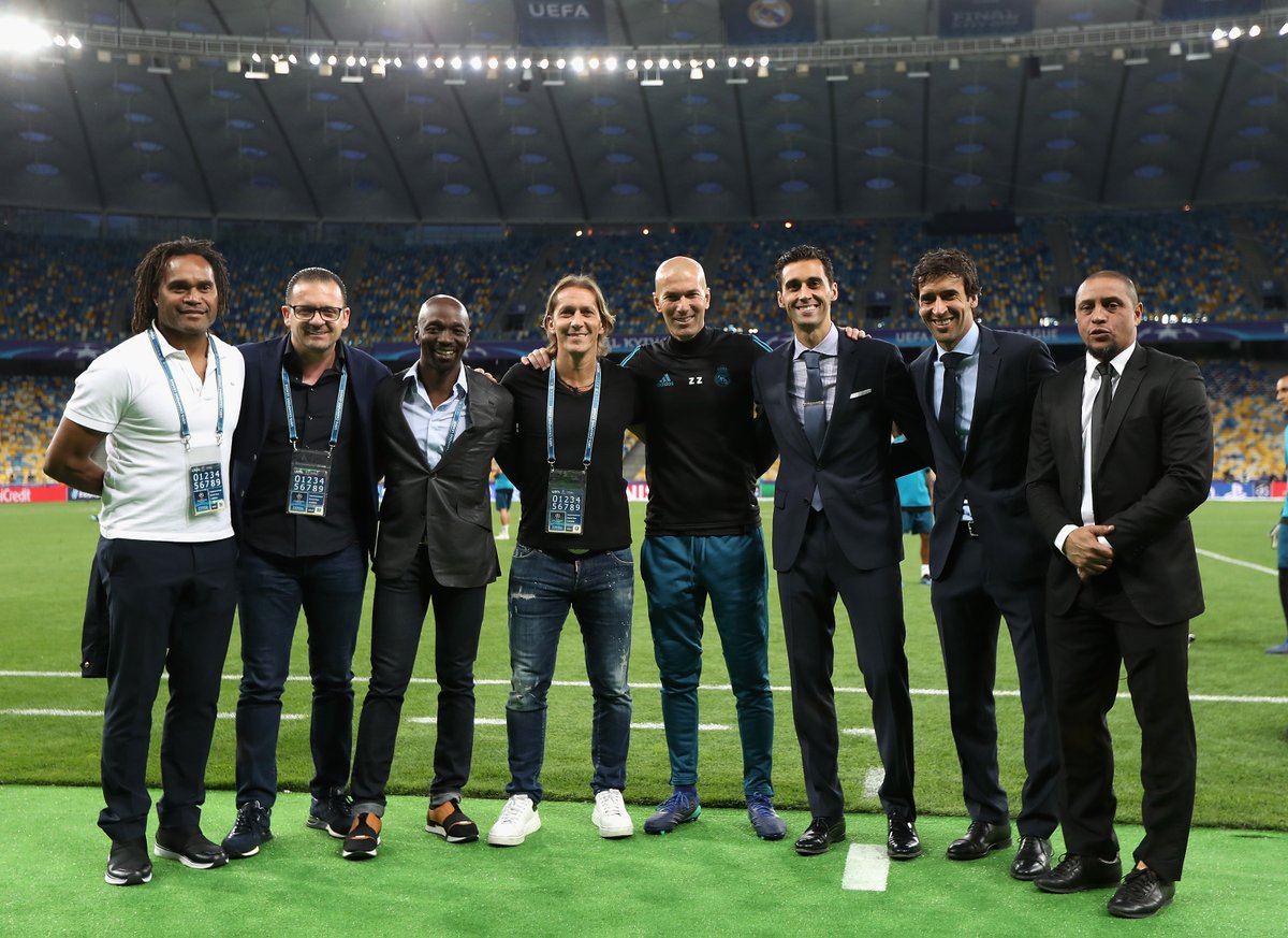 Наставник «Реала» Зинедин Зидан сфотографировался на НСК «Олимпийский» с бывшими партнерами по команде, которые в составе делегации мадридского клуба прибыли поддержать «сливочных» в Киев.