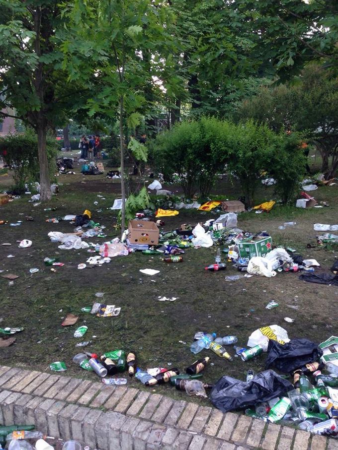Фанаты английского «Ливерпуля», прибывшие в Киев на финал Лиги чемпионов с мадридским «Реалом», оставили в парке Шевченко огромные горы мусора. Болельщики почему-то проигнорировали мусорные баки и предпочли бросать мусор прямо на землю.
