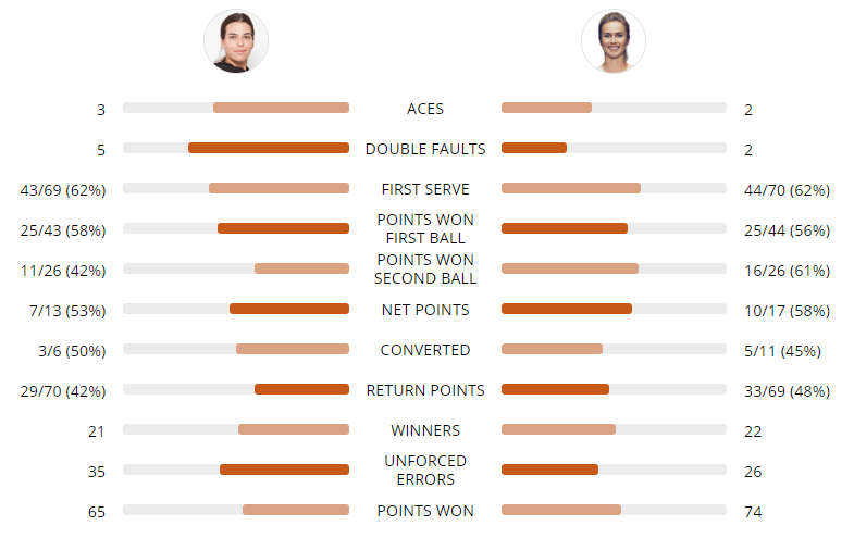 Первый сет начался для Свитолиной неудачно. Украинка проиграла 2 из 3 своих подач, а также не смогла реализовать брейкпоинт при счете 1:2. Соперница доминировала на корте, Томлянович проводила очень качественный, как для себя, поединок. А вот у Свитолиной многое не получалось. Игра Элины сегодня была на порядок слабее, чем на турнире в Риме. Скорее всего, все дело в настрое на конкретный поединок и соперницу. Когда счет в первой партии стал критическим (1:5), на помощь Свитолиной пришла ее соперница. Томлянович вдруг начала много ошибаться, у нее пошли двойные ошибки при подаче на сет в 8 гейме. Этим украинка не могла не воспользоватся и до конца сета выиграла 6 геймов подряд, уйдя с сетбола. В расстроенных чувствах Айла разбила ракетку.