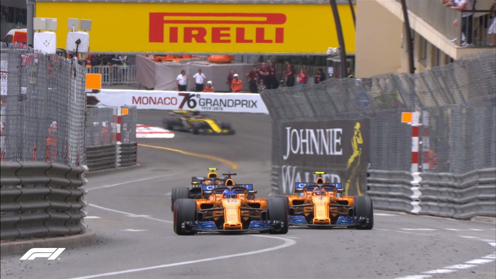 Перший схід гонки стався досить пізно як для Монако – на 53-му колі відмовила коробка передач на «Макларен» Алонсо. У цей же час Сайнса наздогнали Хюлькенберг і Ферстаппен, при цьому двоє останніх їхали на більш м’яких та свіжих шинах. В «Рено» вирішили акуратно розміняти позиції своїх пілотів, але це було непросто, бо Макс їхав притул позаду Ніко. Зрештою на підйомі після першого віража Карлос таки пропустив напарника, залишившись попереду «Ред Булл». Проте на цьому боротьба тільки розпочалася – перша атака Ферстаппена в шикані після тунелю завершилася тим, що Макс по суті виштовхнув «Рено» і Карлос зрізав поворот, залишившись попереду. Та вже колом пізніше той самий поворот зрізав нідерландець і помчав уперед попри скарги Сайнса на неправомірний обгін.
