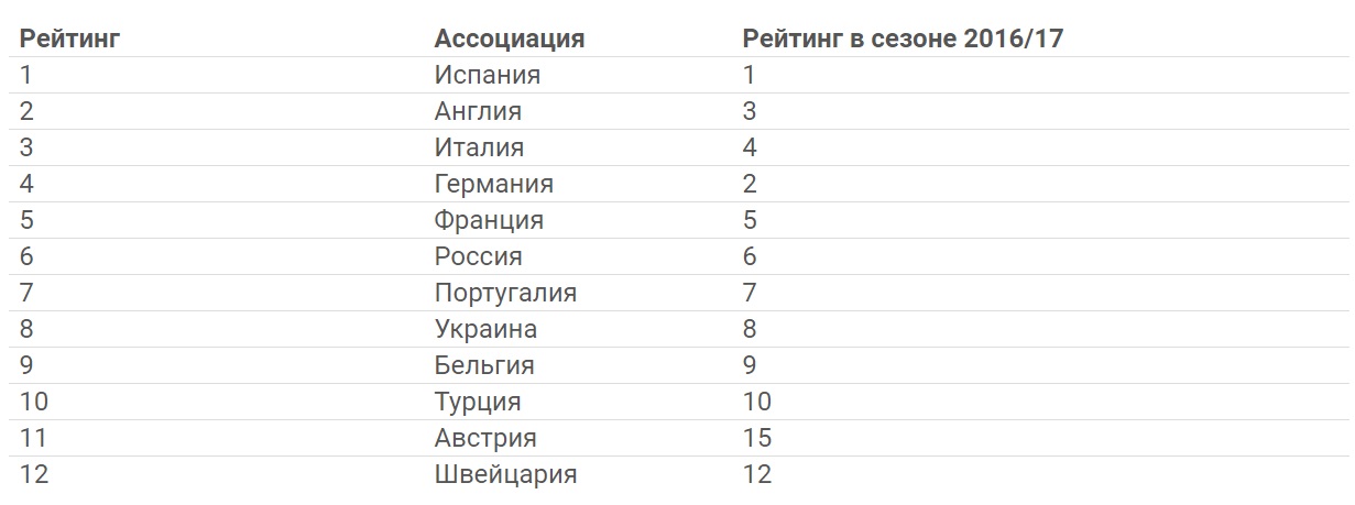 Испания лидирует шестой сезон подряд. Англия и Италия поднялись на строчку выше, а Германия опустилась со второго места на четвертое. Остальные ассоциации в топ-10 , в том числе и Украина, сохранили свои позиции.