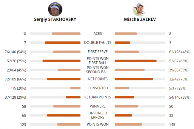 Со старта поединка Стаховский выглядел немного зажато, что вылилось в несколько необязательных и никому не нужных ошибок. Были и его знаменитые неподготовленые выходы к сетке, как же без них. Хотя стоит отметить, что на своей подаче он играл довольно уверенно, но в третьем гейме сошлись сразу несколько факторов, которые и позволили сделать Звереву первый брейк в партии. Второй последовал уже при счете 5:3 в его пользу и, по сути, лишь ускорил неизбежное, ведь шансов у Стаховского на приеме не просматривалось.