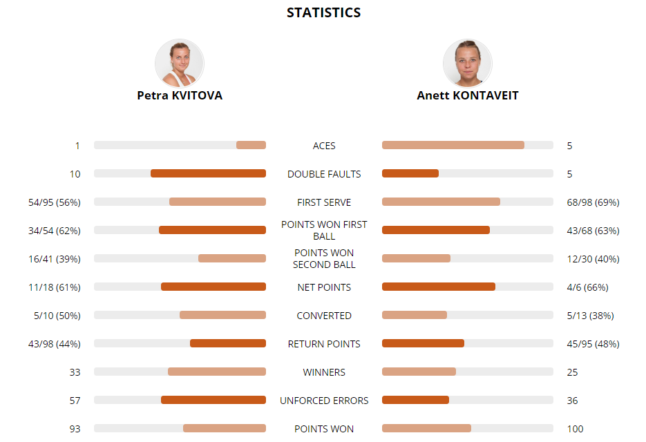 Теннисистки провели на корте 2 часа 7 минут. Контавейт выполнила 5 подач навылет, допустила 5 двойных ошибок и реализовала 5 брейкпойнтов из 13. На счету Квитовой 1 эйс, 10 двойных ошибок и 5 реализованных брейк-пойнтов из 10.