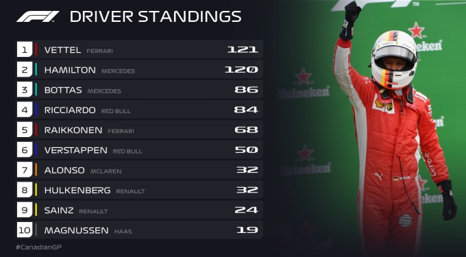 Несмотря на ряд не самых захватывающих этапов, ситуация в общем зачете более чем интересная. Себастьян Феттель благодаря успеху в Канаде и 5-му месту Льюиса Хэмилтона сумел вернуть себе лидерство. Правда, перевес чисто символический - 1 балл. Хотя еще два этапа назад разрыв составлял 17 очков в пользу представителя Мерседеса.