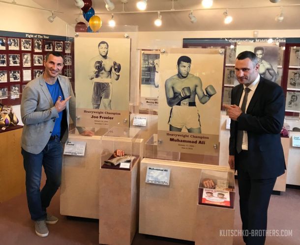 Легендарные украинские боксеры, многократные чемпионы мира в супертяжелом весе Владимир и Виталий Кличко, побывав на церемонии индукции Международного зала боксерской славы, посетили Музей бокса, особое внимание уделив экспонатам, посвященным Мухаммеду Али и Джо Фрезеру.