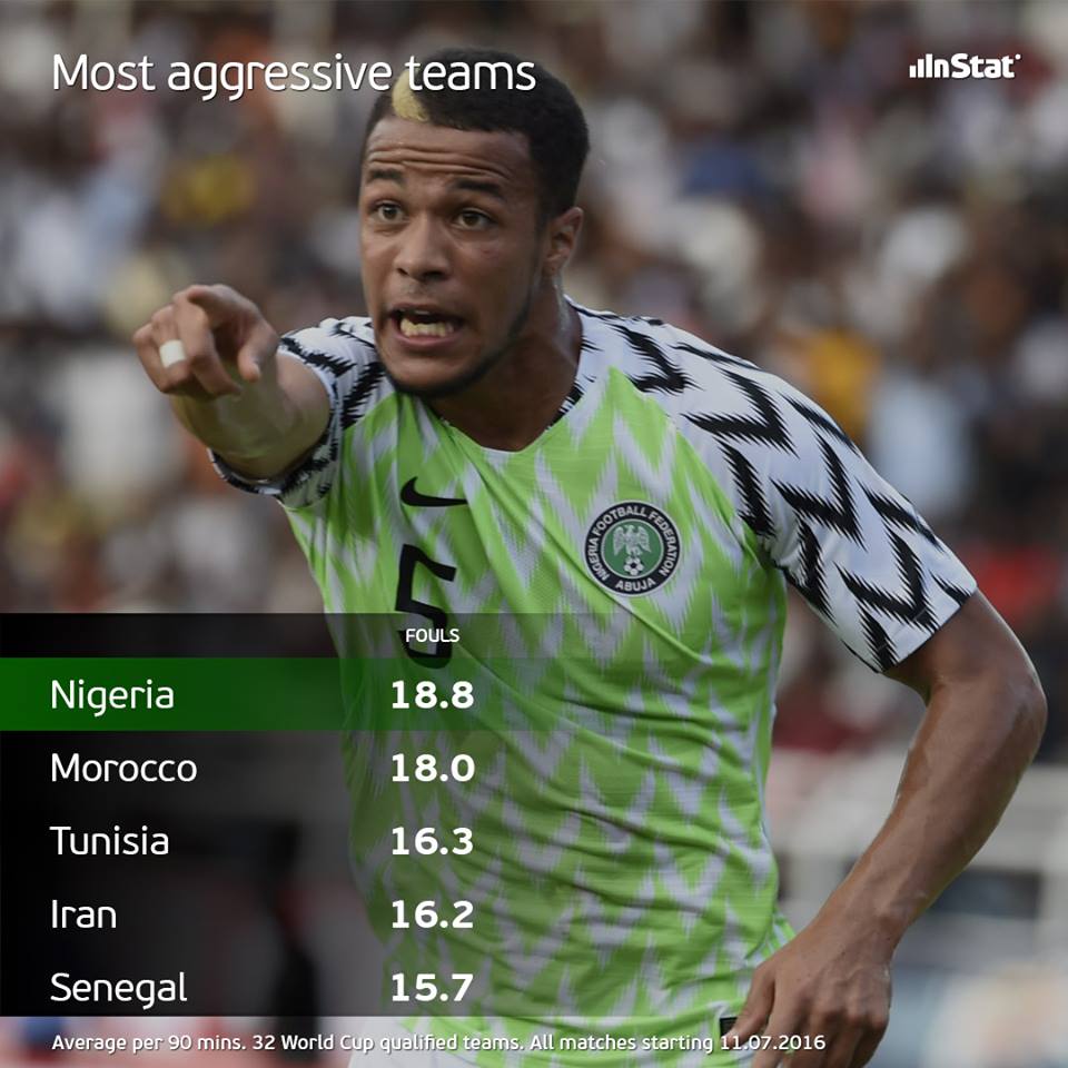 Сборная Нигерии чаще других команд, которые представлены на ЧМ-2018, нарушает правила. В среднем за игру Суперорлы совершають 18,8 нарушений (согласно статистике двух последних сезонов).