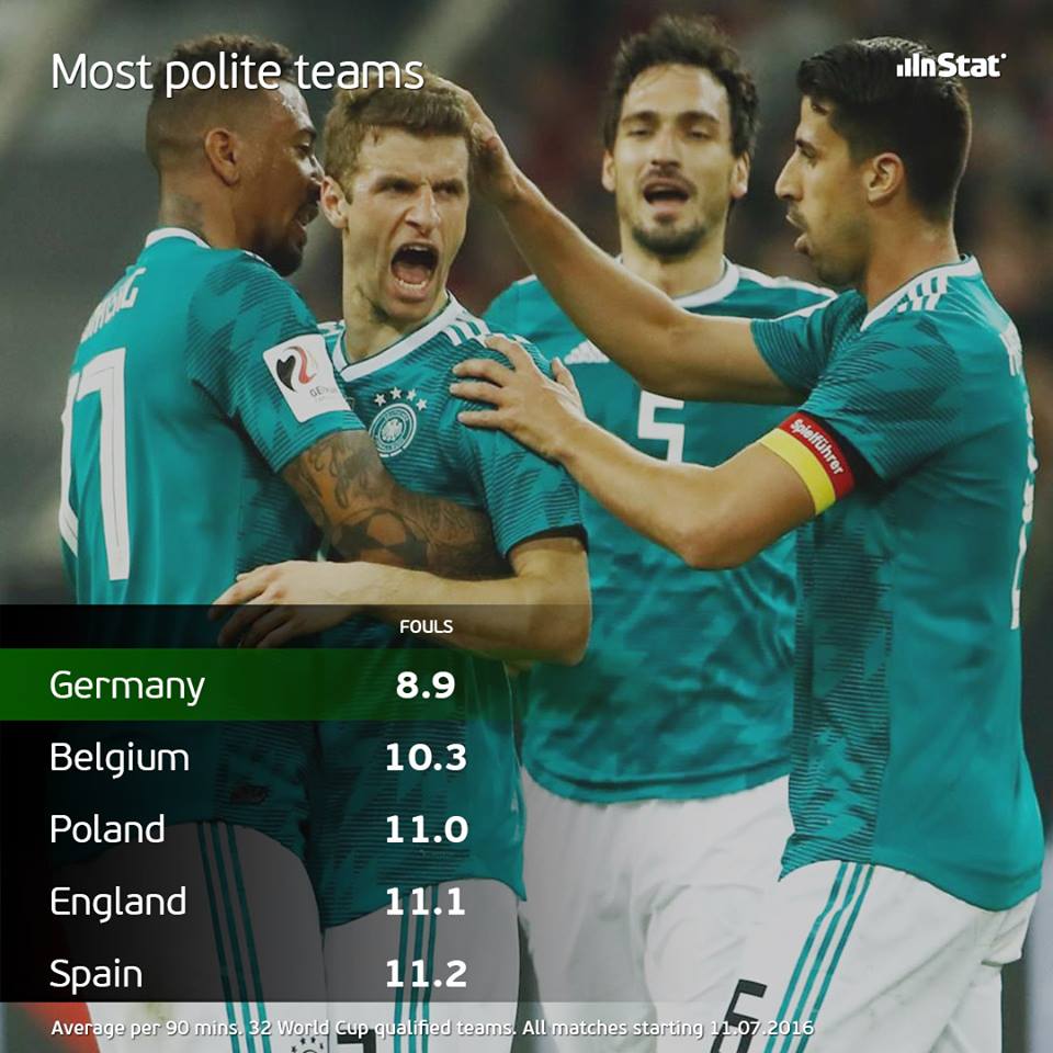 С противоположного полюса рейтинга лучшей стала Германия (8,9 фолов за матч). Кроме того, немцы получают меньше всех желтых карточек – всего 0,7 за игру. Больше всех предупрежений было показано перуанцам (в среднем 2 за игру). У нигерийцев этот показатель равен 1,3 за матч.