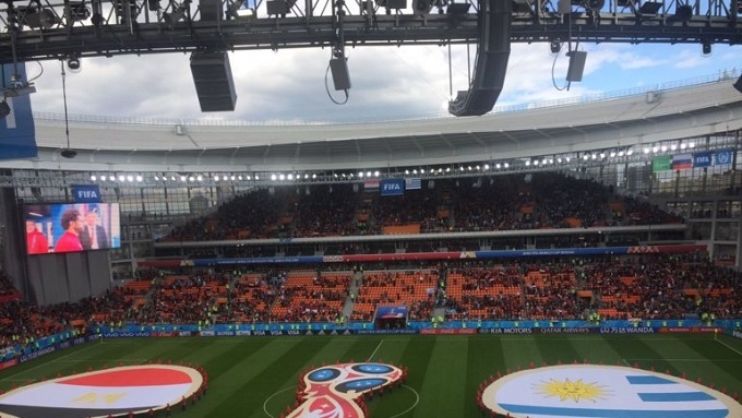 Поединок первого тура в группе А на ЧМ-2018 не смог собрать полные трибуны стадиона «Екатеринбург Арена». Наибольшее количество незанятых мест на центральных трибунах, боковые – заполнены лучше.