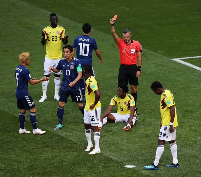 В матче группы H сборная Японии, благодаря удалению одного из игроков соперников на третьей минуте, обыграла Колумбию.