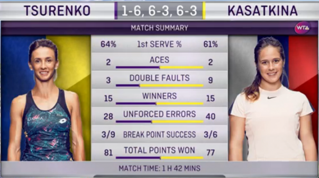 Леся Цуренко (Украина) – Дарья Касаткина (Россия) – 1:6, 6:3, 6:3.