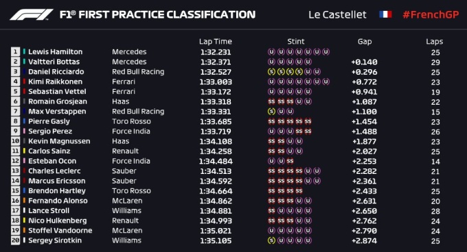 В первой тренировке неплохо себя показал пилот Ред Булла Даниэль Риккардо, который на самых медленных на этапе шинах софт долгое время удерживал лучший результат. Затем, правда, его опередил Валттери Боттас на ультрасофте. В итоге же лучшее время показал Льюис Хэмилтон, опередивший напарника на 0,1 секунды.