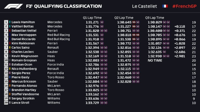 В итоге квалификационный заезд выиграл пилот Мерседеса Льюис Хэмилтон, опередивший напарника Валттери Боттаса. При этом финн в последней попытке был близок к поулу, но немного отстал.