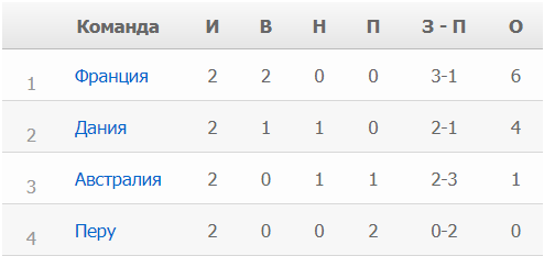 - Австралия выйдет со второго места, если обыграет Перу, а Дания уступит Франции и забьет меньше, чем Австралия. В случае равенства голов (Пример: победа Австралии 1:0 и поражение Дании 1:2) у команд равность по всем показателям до баллов fair play. По баллам: Австралия (3 желтых = -3 балла), Дания (4 желтых = -4 балла). Если Австралия наберет на 1 балл больше, нас ожидает жеребьевка.