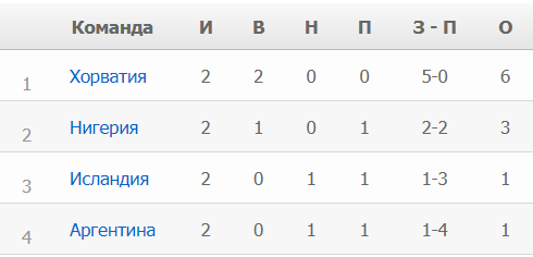 - Хорватия обеспечила себе выход из группы. Модрич и компания не займут первое место только в том случае, если проиграют Исландии, а Нигерия обыграет Аргентину. Общая разница должна составить 6 голов, или 5, если в итоге у Нигерии будет больше забитых, чем у Хорватии (Пример: победа Нигерии 4:0 и поражение Хорватии 0:1).