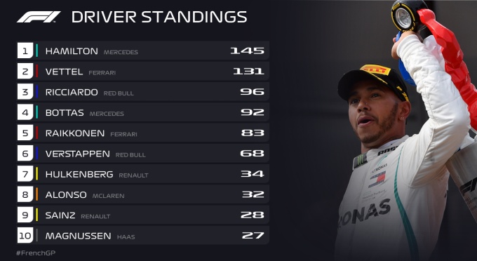 Себастьян в гонке с последнего места прорвался на пятое, но теперь ситуация в борьбе за титул вновь качнулась в сторону представителя Мерседеса, который вернул перевес в 14 очков перед этапом в Австрии, где у немецкой команды, вероятно, снова будет преимущество.