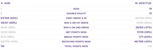 В первом сете Костюк показала нестабильную игру с большим количеством невынужденных ошибок. В шестом и седьмом геймах теннисистки обменялись брейками и были близки к тай-брейку. В 11-м гейме Марта позволила своей сопернице навязать борьбу на своей подаче, подарив несколько скрытых сетболов. Американка с четвертого раза вышла вперед. Подать на партию Ан не смогла, но взяла свое на тай-брейке. Несколько подряд обидных ошибок от Костюк не оставили украинке шансов.