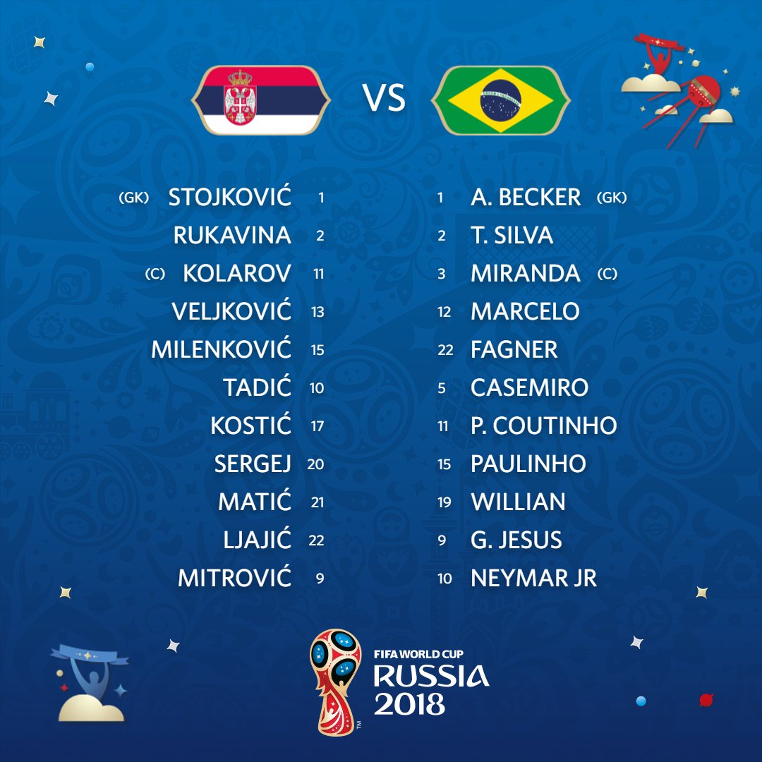 Объявлены стартовые составы сборных Сербии и Бразилии на матч 3-го тура группового этапа чемпионата мира по футболу.