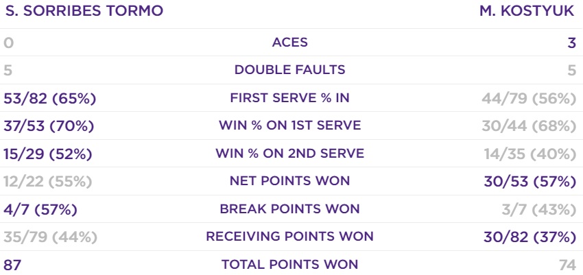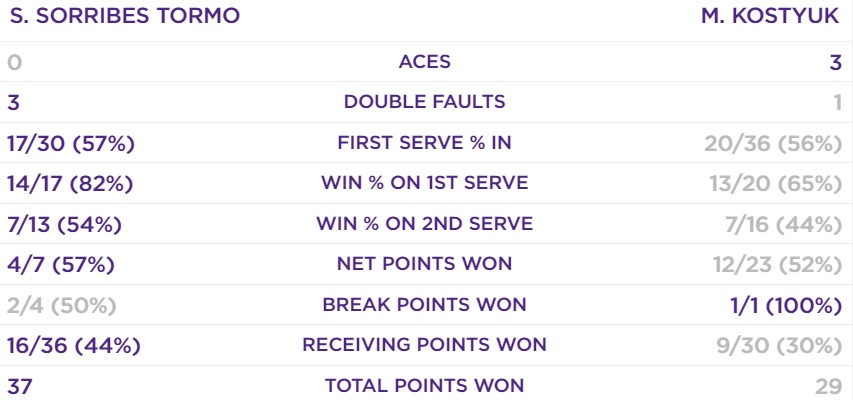 Первый сет финального поединка Марта начала довольно неплохо. На своих подачах она чувствовала себя комфортно, и даже смогла сделать брейк в шестом гейме. К сожалению, сразу же испанка организовала обратный брейк, выиграв 2 гейма под ноль подряд. Костюк хватило сил заработать пятое очко, но в 11-м гейме игра на больше-меньше завершилась не в ее пользу, а в 12-м Соррибес-Тормо без проблем подала на сет.