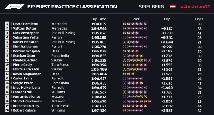 Феррари традиционно для пятницы довольно существенно отстает, а вслед за лидерами расположился Макс Ферстаппен, уступивший Хэмилтону 0,2 секунды.