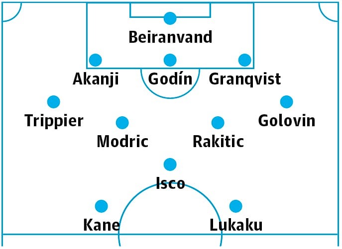 В состав лучших вошли вратарь Алиреза Бейранванд (Иран), защитники Мануэль Аканджи (Швейцария), Диего Годин (Уругвай), Андреас Гранквист (Швеция), полузащитники Киран Триппьер (Англия), Иско (Испания), Лука Модрич, Иван Ракитич (оба - Хорватия), Александр Головин (Россия), нападающие Гарри Кейн (Англия), Ромелу Лукаку (Бельгия). Кроме Бейранванда игроки представляют сборные, которые вышли в плей-офф чемпионата мира. Кейн является лучшим бомбардиром группового этапа, он забил пять голов в трех матчах. Лукаку занимает второе место (4).
