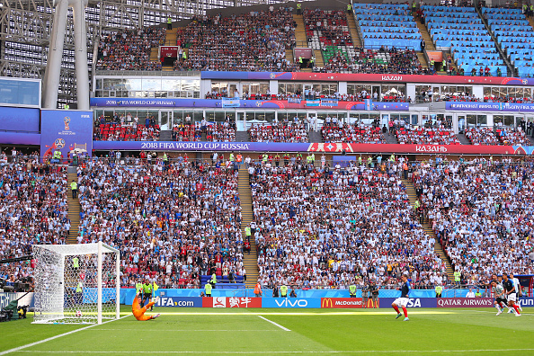 Поединок начался с борьбы команд за центр поля. Быстрые французы раз за разом находили свободные зоны возле штрафной соперников, и вскоре «трехцветным» удалось заработать штрафной метрах в 25-ти от ворот. К мячу подошел Гризманн, технично пробивший через «стенку» без шансов для голкипера. Ворота сборной Аргентины спасла перекладина. А далее последовал крейсерский забег в исполнении Мбаппе. Форвард перехватил мяч на своей половине поля, после скоростного рывка ворвался в штрафную аргентинцев и упал после контакта с Рохо. Безусловное назначение пенальти, желтая карточка для защитника и точный удар с точки от Гризманна подсуммировали этот эпизод.