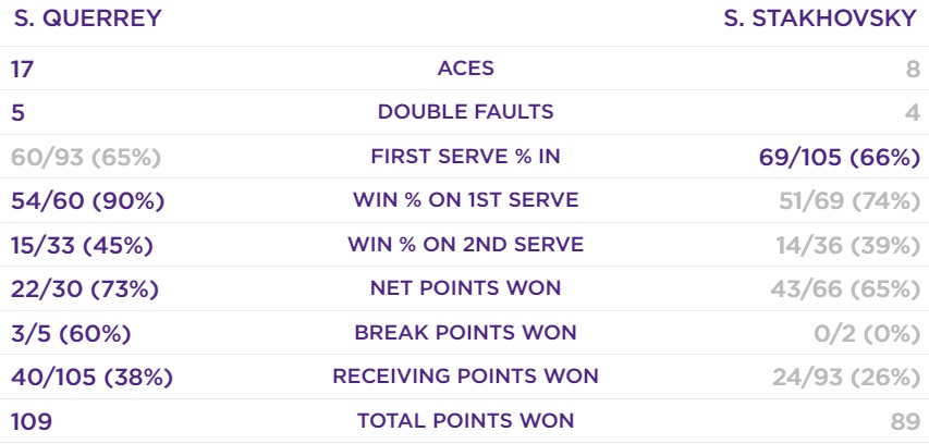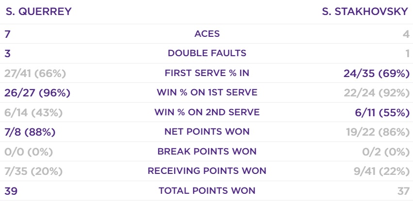 Победитель стартовой партии должен был определиться на тай-брейке, где Стаховский совершил роковую ошибку при счете 3:4, позволив Сэму сделать мини-брейк. После этого момента каких-либо шансов в матче для Сергея не просматривалось вообще.